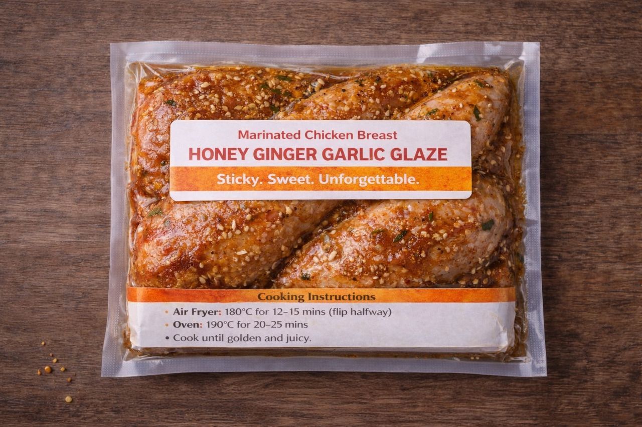 Juicy chicken breast, marinated in our signature honey, ginger and garlic glaze that hits sweet, warm and deeply savoury in every bite. It caramelises beautifully as it cooks, giving you that glossy, sticky finish without the heaviness.