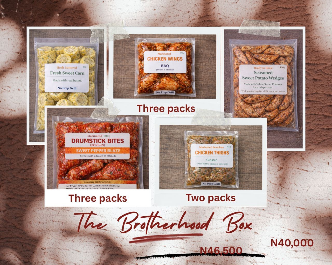 Well-marinated meats, wedges, and sauces that bring the flavour—just add your drinks and enjoy.